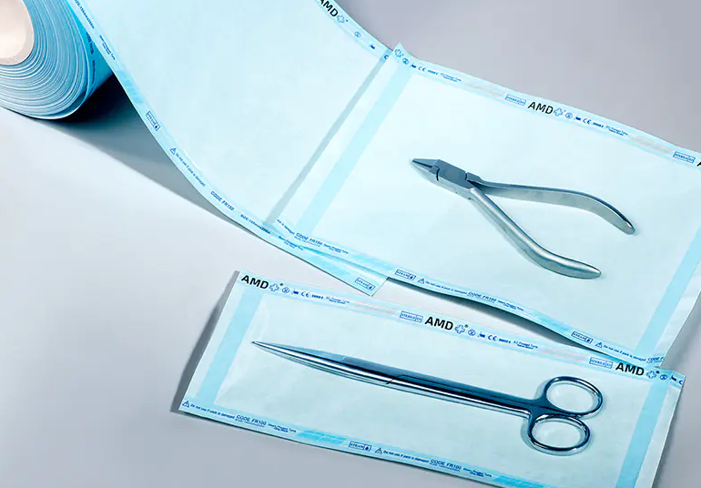Material: Os materiais comuns incluem papel kraft de grau médico, Tyvek® e laminados de filme plástico.